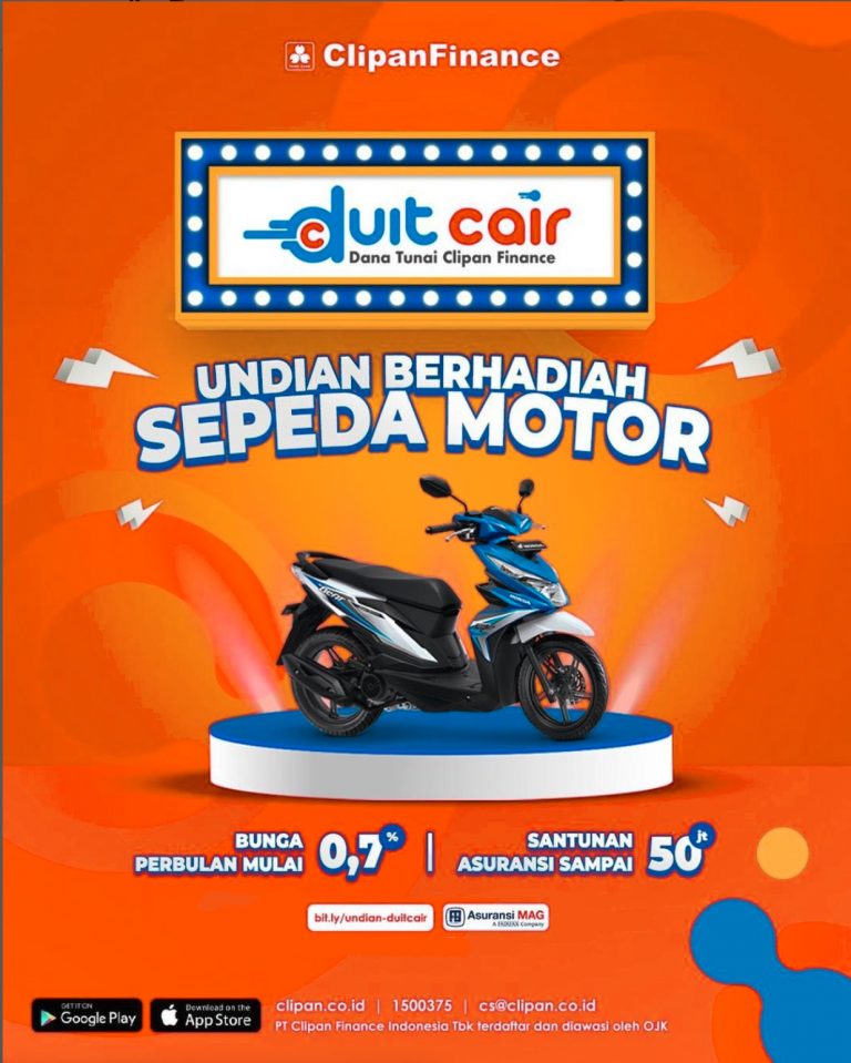 Program Undian Berhadiah adalah program apresiasi bagi Debitur yang mengajukan kredit dana tunai Clipan Finance (Duit Cair) selama periode 21 Oktober 2021 hingga 30 April 2022. Lebih dari 200 debitur yang masuk kriteria program dan 1 (satu) orang pemenang berhak memenangkan hadiah 1 (satu) buah sepeda motor.