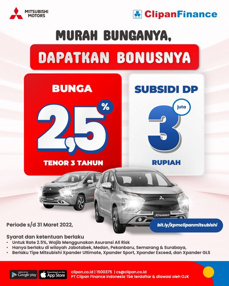 Ini saat yang tepat untuk punya mobil Mitsubishi Xpander baru!! Nikmati penawaran bunga spesial dari Clipan Finance 2.5% untuk tenor 3 tahun* serta Dapatkan Subsidi TDP Rp. 3 Juta berupa potongan langsung TDP (total pembayaran pertama) untuk setiap pengajuan Mitsubishi Xpander Ultimate, Xpander Sport, Xpander Exceed, dan Xpander GLS.