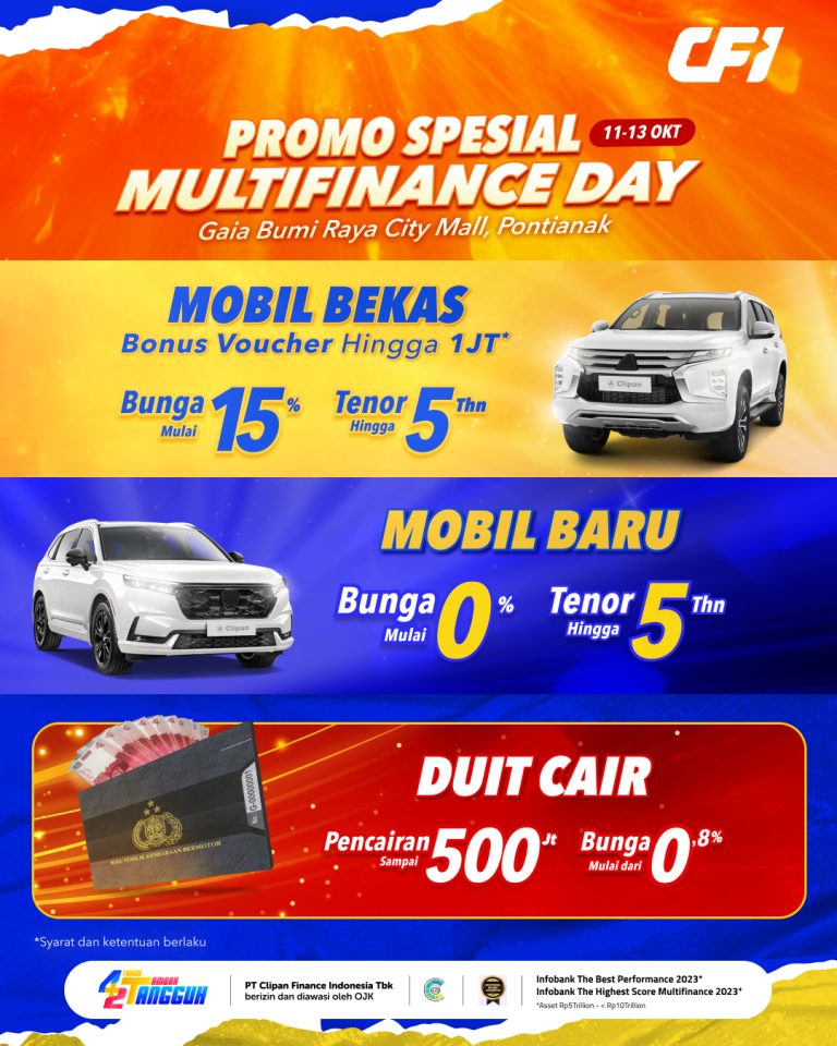 Jangan lewatkan kesempatan untuk menikmati promo-promo spesial ini di acara Multifinance Day 2024. Kunjungi booth Clipan Finance di Gaia Bumi Raya City Mall, Pontianak, dan
